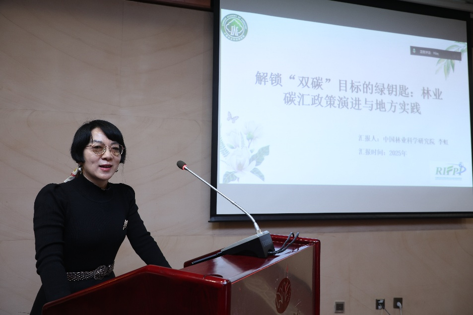 中国林业科学院李虹研究员作《解锁“双碳”目标的绿钥匙:林业碳汇政策演进与地方实践》主题报告,系统阐述了林业碳汇作为应对全球气候变化支柱的全球意义,强调其是实现“双碳”目标的关键“压舱石”,系统介绍了林地、草地、湿地碳汇发展的具体进展,并介绍了当前面临的重要问题,阐述了林业碳汇在推动碳中和与绿色发展中的重要作用。